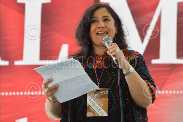 Irma Eréndira Sandoval, ex secretaría de la Función Pública, durante su participación en la primer Convención Nacional Morenista realizada en la explanada del Monumento a la Revolución.