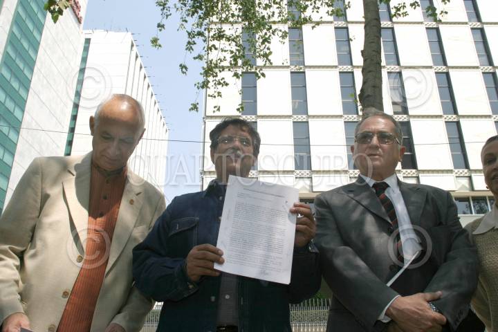 MEXICO, D.F. 04ABRIL2005.- El doctor Gilberto López Rivas, el físcal Enrique González Ruíz y Gustavo Iruegas, muestran el documento con el que notifican al embajador de los Estados Unidos en México, que el Tribunal Internacional Benito Juárez, juzgará los crímenes cometido por su país contra el pueblo de Cuba. FOTO: Nelly Salas/CUARTOSCURO.COM