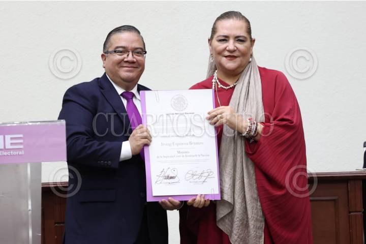 CIUDAD DE MÉXICO, 01SEPTIEMBRE2025.- Irving Espinosa Betanzo, recibió su constancia que lo ratifican como ministro de la Suprema Corte de Justicia de la Nación (SCJN), durante sesión solemne del Primer Periodo de Sesiones Ordinarias del segundo año de ejercicio de LXVI Legislatura en la Cámara de Senadores. Lo acompaña: Laura Itzel Castillo, presidenta de la mesa directiva. FOTO: MARIO JASSO/CUARTOSCURO.COM