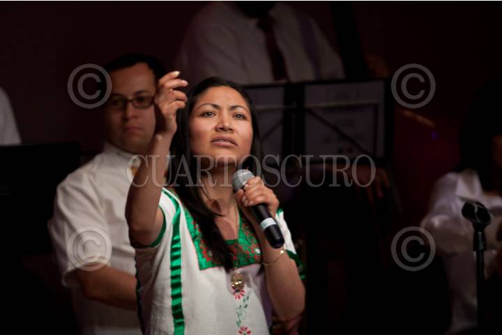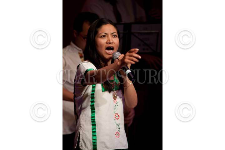 MÉXICO D.F., 20FEBRERO2011.- Edith Ortiz, soprano de origen oaxacaqueño, durante su participación en la ceremonia donde el escritor Maya, Isaac Esau Carrillo, recibió el Premio Nezahualcóyotl de Literatura de Lenguas Mexicanas 2010, en la sala Manuel M. Ponce del Palacio de Bellas Artes. FOTO: GUILLERMO PEREA/CUARTOSCURO.COM