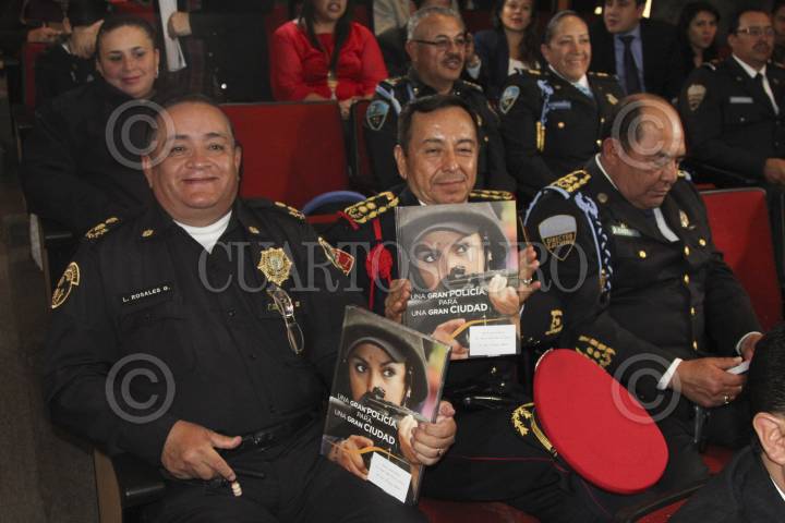 MÉXICO, D.F., 18DICIEMBRE2013.- Isaac Esquivel, fotoperiodista de la Agencia Cuartoscuro, Beatriz Pages Rebollar, directora de la revista Siempre, Jesús Rodríguez Almeida, titular de la SSP-DF y Jorge Luis Gallegos, fotoperiodista, durante la presentación del libro "Una Gran Policía para una Gran Ciudad" realizado en las instalaciones de la SSP-DF. FOTO: SAÚL LÓPEZ /CUARTOSCURO.COM