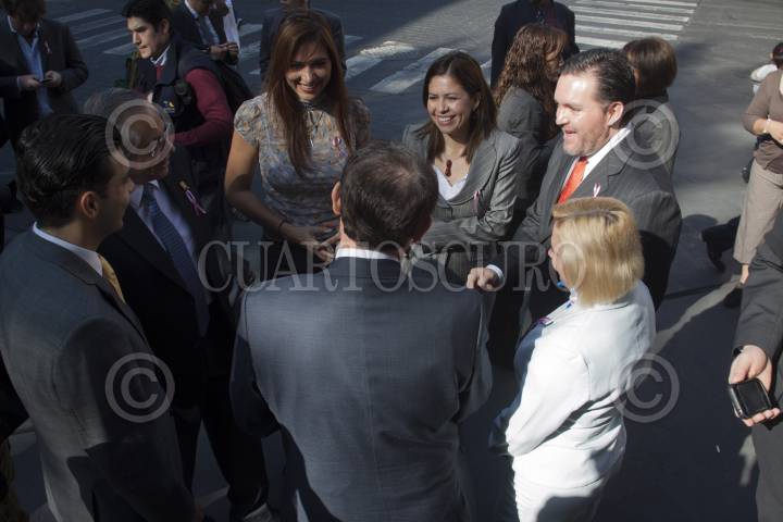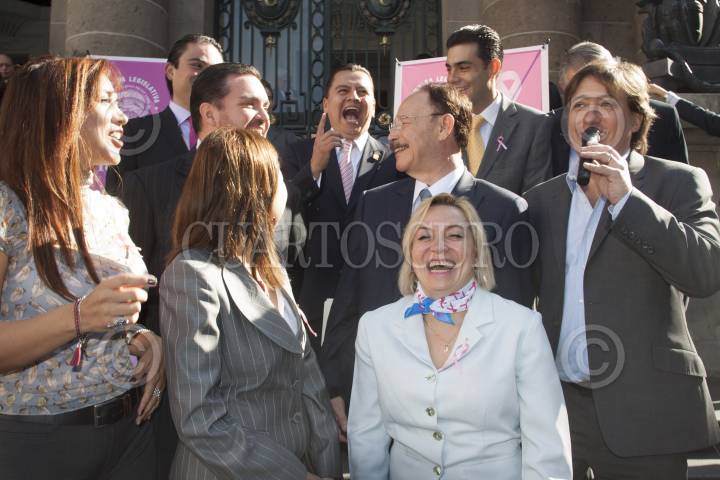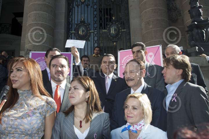 MÉXICO, D.F. 18OCTUBRE2012.-Los asambleístas Jesús Sesma, Jorge Gaviño Ambriz, Miriam Saldaña Cháirez, Isabel Priscila Vera Hernández, Federico Döring, y Olivia Garza de los Santos, entregaron un cheque a la Fundación de lucha contra el Cáncer de Mama (FUCAM), por más de 107 mil pesos como donativo de “Un Día de Dieta” contra el cáncer de mama, en las escalinatas de la Asamblea Legislativa. FOTO: MOISÉS PABLO /CUARTOSCURO.COM