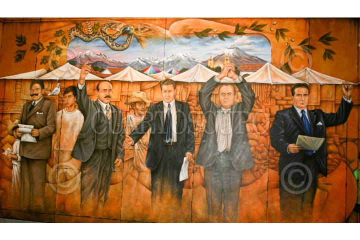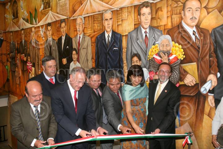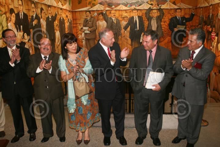 TOLUCA, ESTADO DE MÉXICO, 14SEPTIEMBRE2011.- Inauguraron la tarde de hoy el mural “La Construcción de un estado” del pintor Ismael Ramos en las escalinatas del palacio de gobierno de Toluca, al lugar asistió el pintor, el Secretario de Educacion, Alberto Curi Naime, Martha Hilda González Calderón, Secretaria de Turismo del Estado de México y Agustín Gasca Pliego, director del Instituto Mexiquense de Cultura. FOTO: SAÚL LÓPEZ/CUARTOSCURO