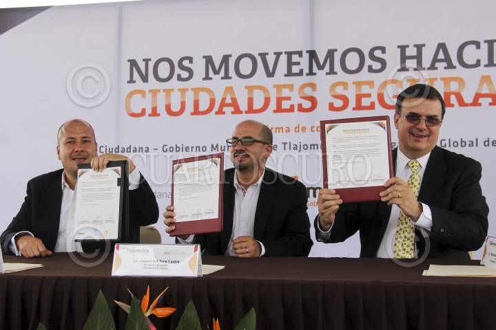 TLAJOMULCO DE ZÚÑIGA, JALISCO, 09SEPTIEMBRE2013.- Marcelo Ebrard Casaubón, Presidente de la Comisión de Ciudades Seguras de la Organización de las Naciones Unidas (ONU) y ex Jefe de Gobierno del Distrito Federal, junto a Enrique Alfaro, ex alcalde del municipio, e Ismael del Toro, actual Presidente Municipal de Tlajomulco durante su visita a la entidad. Los mandatarios firmaron un convenio que permite la proximidad entre Tlajomulco y las tres mil 500 ciudades del planeta que se han sumado al modelo de ciudades seguras encabezado por Ebrard. FOTO: FERNANDO CARRANZA GARCÍA /CUARTOSCURO.COM