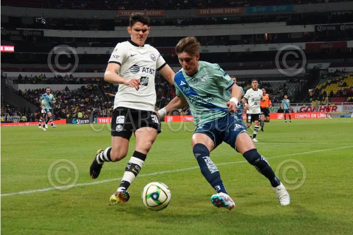 CIUDAD DE MÉXICO, 23MAYO2024. Israel Reyes de las Águilas disputa una pelota a Carlos Rotondi de la Máquina Celeste durante el partido de fútbol Cruz Azul vs América correspondiente a la final de ida del Torneo Clausura 2024 de la Liga BBVA MX, en el Estadio Ciudad de los Deportes. FOTO: EDGAR NEGRETE LIRA/CUARTOSCURO.COM