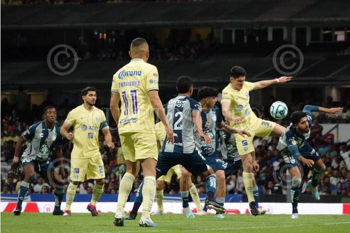 El jugador Israel Reyes, defensa central del América, y Mauricio Isaís, lateral izquierdo del equipo de Pachuca, disputaron el balón durante el Torneo Clausura 2023, Jornada 10 en el Estadio Azteca