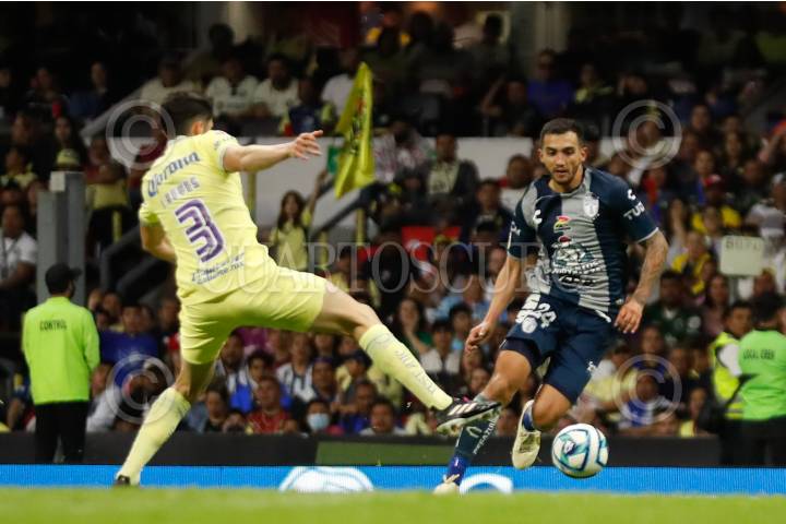 Israel Reyes, defensa central del Club America, y Luis Chávez, mediocampista del Pachuca, disputaron el balón durante el Torneo 2023, Jornada 10, en el Estadio Azteca