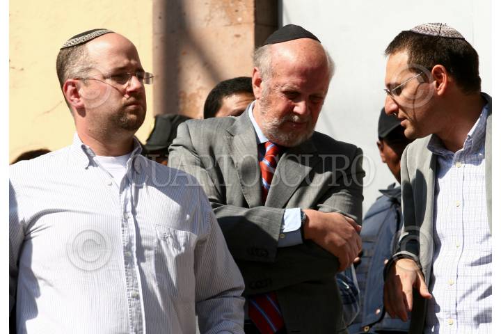 MÉXICO, D.F., 09ENERO2009.- Ciudadanos de origen israelí avencidados en nuestro país junto con simpatizantes organizaron un protesta pacífica en las afueras de la embajada de Israel en Lomas de Chapultepec, para pedir se termine el sitio de guerra que se vive en medio oriente después de que hace unas semanas se desato un conflicto bélico en la Franja de Gaza territorio que se disputa los judios con la organización arabe Hamas. En la imagen el rabino Marcelo Rittner(centro) junto con otros judíos. FOTO: MOISÉS PABLO/CUARTOSCURO.COM