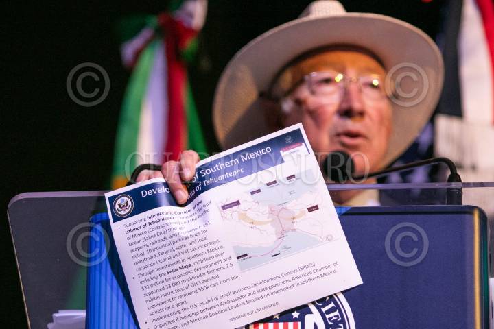 CIUDAD DE MÉXICO, 04SEPTIEMBRE2024.- Ken Salazar, embajador de Estados Unidos en México, muestra una lámina en donde habla de un proyecto de desarrollo económico en el Istmo de Tehuantepec, Oaxaca, durante su ponencia en la reunión binacional del American Society of Mexico. FOTO: MOISÉS PABLO/CUARTOSCURO.COM