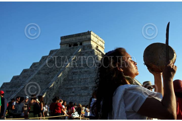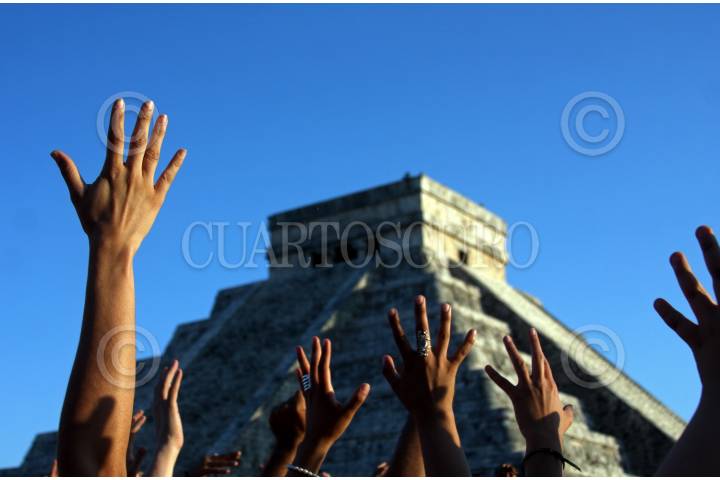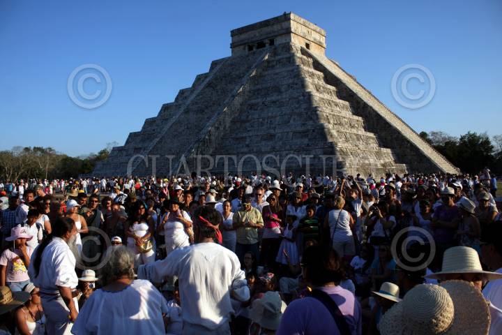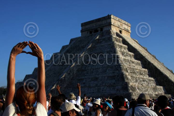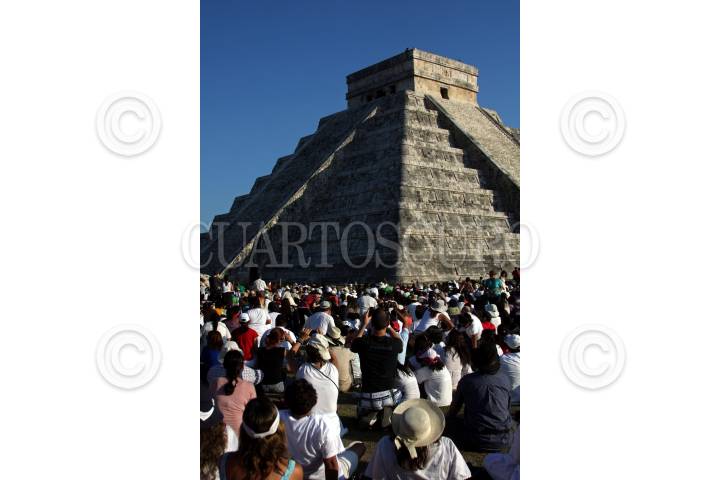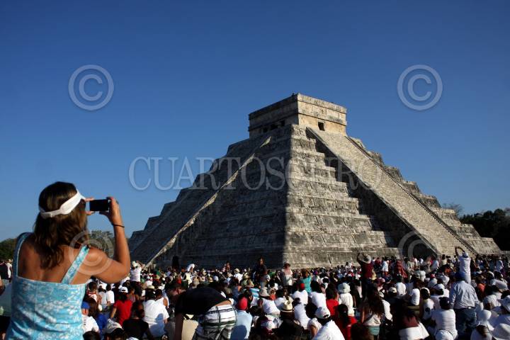 CHICHÉN ITZA, YUCATÁN, 21MARZO2011.- Miles de personas visitaron la zona arqueológica de Chichén Itzá, para observar el fenómeno de luz y sombra del descenso de Kukulcán, ayer domingo 20 de marzo de 2011, en el inicio de la Primavera; fue cerca de las 4:20 de la tarde cuando comenzó a observarse el fenómeno de luz y sombra, y la presencia de los rayos solares reflejados en los triángulos isósceles de la pirámide principal, permitieron imaginar el descenso de una serpiente maya del propio castillo arqueológico. FOTO: FRANCISCO BALDERAS/CUARTOSCURO.COM