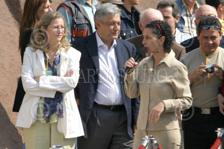 MÉXICO, D.F., 01DICIEMBRE2006.- José Agustín Pinchetti, Secretario de Hacienda del gabinete Alterno, con Asa Cristina Laurent, Secretaria de Salud, Laura Itzel Castillo, Secretaria de Vivienda y Claudia Sheimbaum, Secretaría de Ecología y Medio Ambiente, durante el mitin de Andrés Manuel López Obrador, presidente legítimo proclamado por el Frente Amplio Progresista, en protesta por la toma de Felipe Calderón, Presidente Constitucional. FOTO: MOISÉS PABLO/CUARTOSCURO.COM