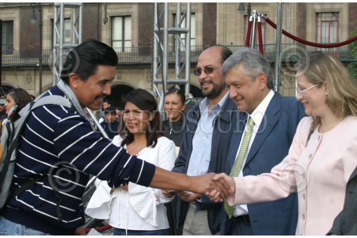 MEXICO, DF 24JULIO2005.- El jefe de gobierno del Distrito Federal, Andrés Manuel López junto a la directora de desarrollo urbano del GDF, Laura Itzel Castillo durante la entrega de apoyos a la vivienda en el zócalo de la ciudad. FOTO: Miguel Dimayuga/CUARTOSCURO.COM