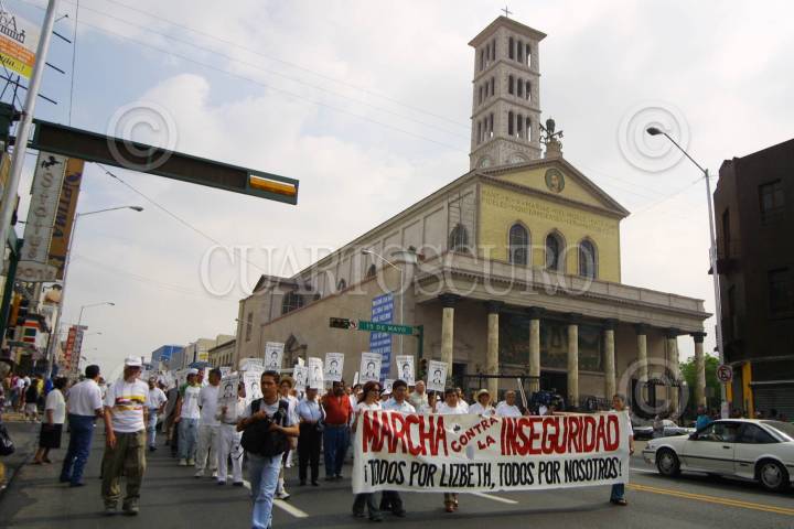 Monterrey, N.L. 27 de Junio de 2004 Un grupo de amigos de la joven jalisciense, Lizbeth Itzel Salinas, ex alumna del Tecnológico de Monterrey, quien fue agredida, robada y arrojada de un taxi en el Distrito Federal y que posteriormente falleció a causa de ese ataque, realizo una marcha silenciosa, en contra de la inseguridad a la par de la gran mega-marcha organizada en el D.F. FOTO: JORGE LOPEZ/CUARTOSCURO.COM