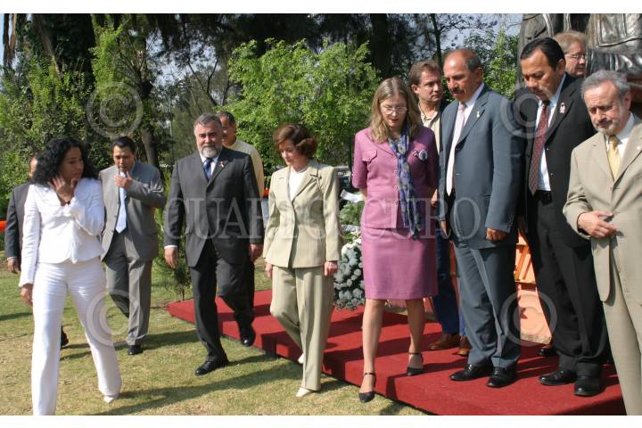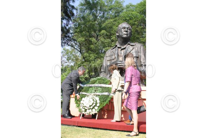 MEXICO, D.F. 05ABRIL2005.- Alejandro Encinas, sub secretario de Gobierno capitalino, acompañado de Laura Itzel Castillo, secretaria de Desarrollo Urbano y su hermana, colocan una ofrenda floral al busto de su padre Heberto Castillo, en su octavo aniversario luctuoso. FOTO: Sandra Perdomo/CUARTOSCURO.COM
