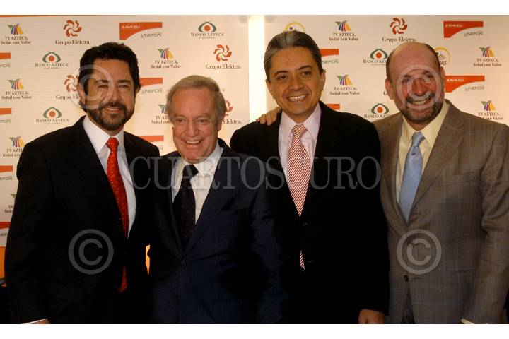 MÉXICO D.F. 05MARZO2007.- El comentarista deportivo José Ramón Fernández acompañado de Carlos Septién, director general de Grupo Electra y Banco Azteca, de Mario San Román director general de TV Azteca y de Gustavo Guzmán director general de Iusacell, en conferencia de prensa anunció su regreso a televisora del ajusco en un programa proximo a salir al aire. FOTO: GUILLERMO PEREA/CUARTOSCURO.COM