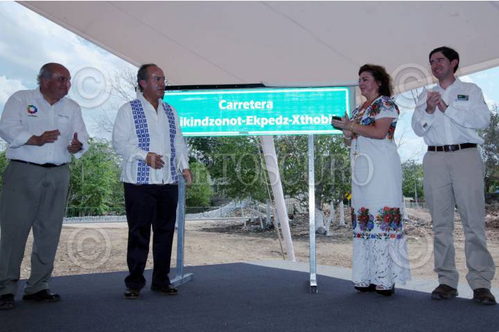 TIXCALCUPUL YUCATAN, 25ABRIL2011.- Felipe Calderon, Presidente de México junto a Ivone Ortega Pacheco, Gobernadora del estado durante la inauguracion de la carretera Chikindzonot-Ekpedz-Xthobil. FOTO: ALFREDO GUERRERO/CUARTOSCURO.COM