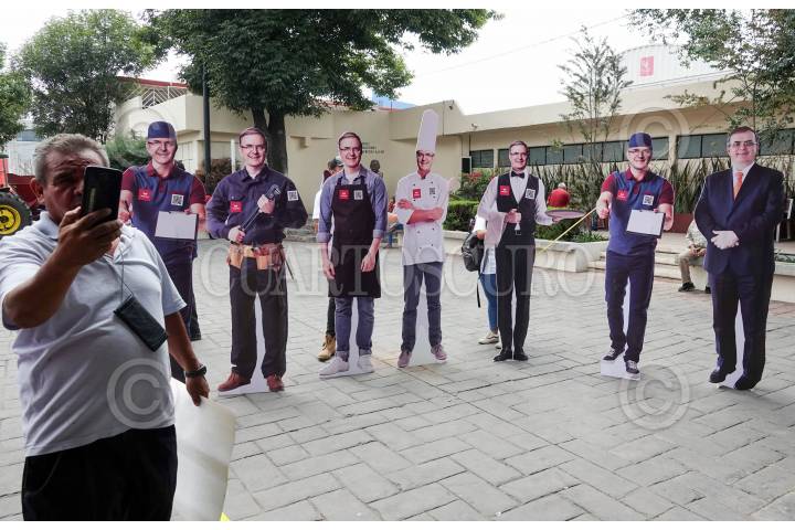 Un hombre se fotografia con las diferentes versiones de Marcelo Ebrard previo a la asamblea informativa en la explanada municipal de Ixtapaluca, Estado de México, cómo parte de su gira para la elección interna de MORENA.