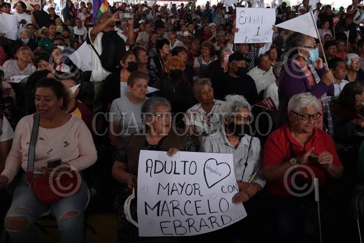 Adultos mayores expresan su apoyo a Marcelo Ebrard durante la asamblea informativa en la explanada municipal de Ixtapaluca, Estado de México, cómo parte de su gira para la elección interna de MORENA.