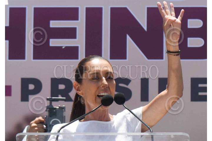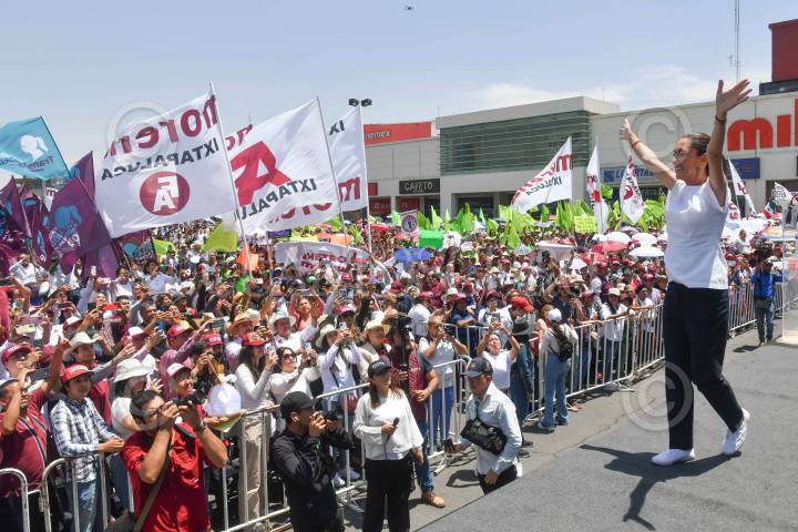 CHIMALHUACÁN, ESTADO DE MÉXICO, 09ABRIL2024.- Claudia Sheinbaum, candidata a la presidencia por la coalición "Sigamos Haciendo Historia (PT, PVEM y Morena), durante el mitin de campaña realizado en el recinto ferial de la colonia Santa María Nativitas. FOTO: MARIO JASSO/CUARTOSCURO.COM
