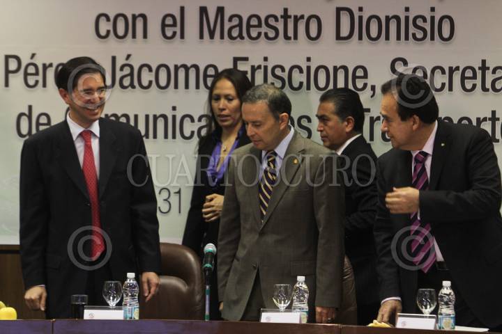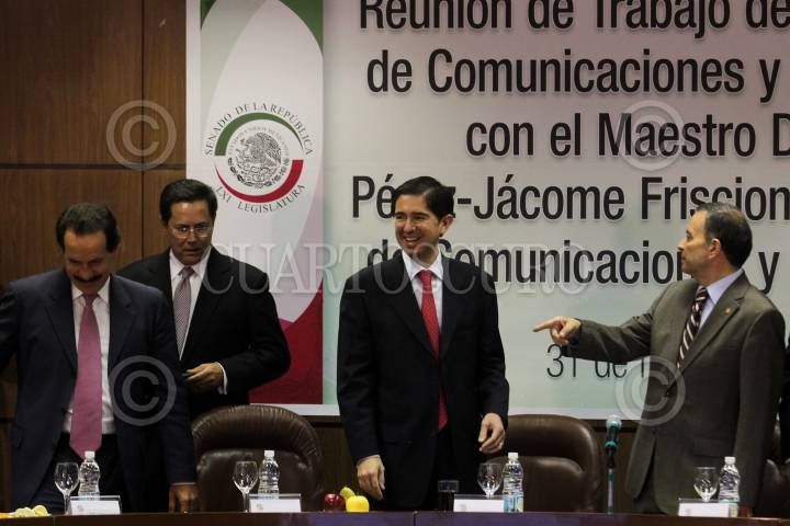 MÉXICO, D.F., 31MARZO2011.- Los senadores, Juan Bueno Torio y Jose Julia y Fernando Castro Trenti junto a Dionisio Perez Jácome, Secretario de Comunicaciones y Transporte durante la reunión de Trabajo de la Comisión de Comunicaciones y Transporte. FOTO: ENRIQUE ORDÓÑEZ/CUARTOSCURO.COM