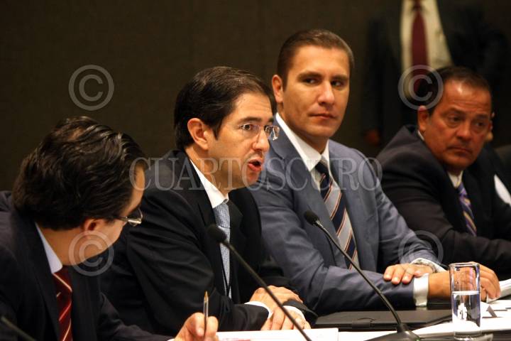 MÉXICO, D.F., 31MARZO2011.- Los senadores, Juan Bueno Torio y Jose Julia, junto a Dionisio Perez Jácome, Secretario de Comunicaciones y Transporte y Fernando Castro Trenti durante la reunión de Trabajo de la Comisión de Comunicaciones y Transporte. FOTO: ENRIQUE ORDÓÑEZ/CUARTOSCURO.COM