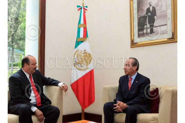 MÉXICO, D.F., 13JULIO2010.- Cesar Duarte Jaquez, Gobernador electo del estado de Chihuahua, junto a Felipe Calderón, Presidente de México durante la reunión que sostuvo esta mañana. FOTO: ALFREDO GUERRERO/CUARTOSCURO.COM