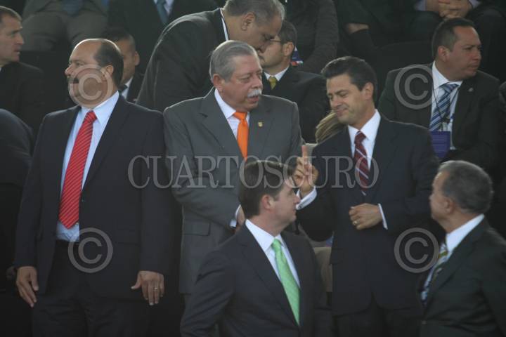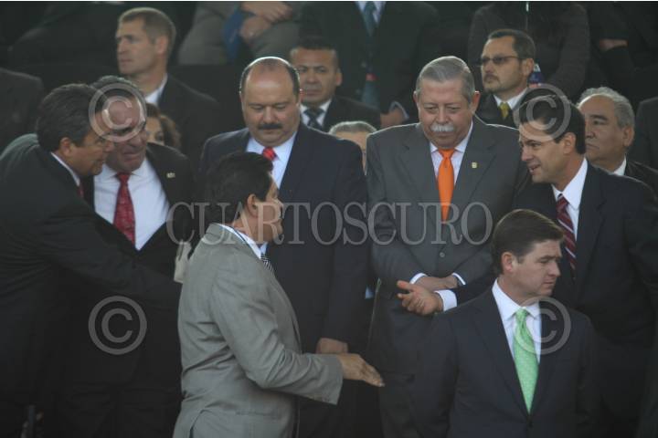 MÉXICO, D.F., 02JUNIO2011.- Carlos Lozano de la Torre, gobernador de Aguascalientes; César Duarte Jáquez, gobernador de Chihuahua; Mario López Valdez, gobernador de Sinaloa; Egidio Torre Cantú, gobernador de Tamaulipas; Enrique Peña Nieto, gobernador del Estado de México y Rodrigo Medina de la Cruz, gobernador de Nuevo León durante el evento de conmemoración del Día del Policía que se realizo en el Centro de Alto Mando de la Policía Federal. FOTO: RODOLFO ANGULO/CUARTOSCURO.COM