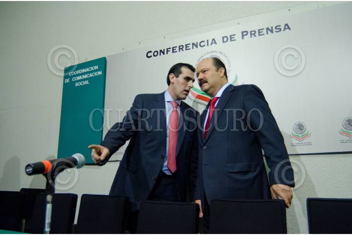 MÉXICO, D.F., 25OCTUBRE2011.- Jorge Herrera Caldera y Cesar Duarte Jaquez, gobernadores de Durango y Chihuahua, respectivamente, durante una conferencia de prensa donde denunciaron la grave crísis del campo mexicano en el norte del país. FOTO: MISAEL VALTIERRA/CUARTOSCURO.COM