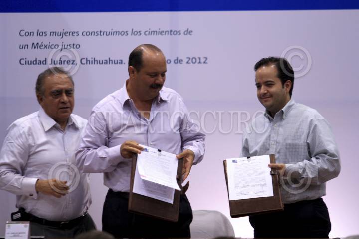 CIUDAD JUÁREZ, CHIHUAHUA, 26JULIO2012.- César Duarte Jáquez, gobernador del Estado; y Alejandro Poiré, Secretario de Gobernación; firmaron las modificaciones realizadas al Protocolo Alba, implementado para la búsqueda inmediata de mujeres y niños desaparecidos. FOTO: NACHO RUIZ /CUARTOSCURO.COM