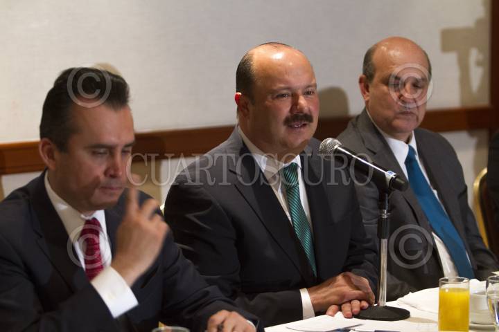 MÉXICO, D.F., 25OCTUBRE2011.- Miguel Alonso Reyes, Jorge Herrera Caldera y Cesar Duarte Jaquez, gobernadores de Zacatecas, Durango y Chihuahua, respectivamente, durante una conferencia de prensa donde denunciaron la grave crísis del campo mexicano en el norte del país. FOTO: MISAEL VALTIERRA/CUARTOSCURO.COM
