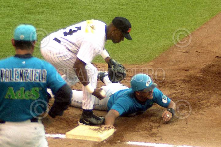 José Muñoz jardinero central de los Saraperos de Saltillo revira a primera base ante un robo fallido, ante la mirada de Julio Franco primera base de los Tigres capitalinos. FOTO: David Bolaños/CUARTOSCURO.COM