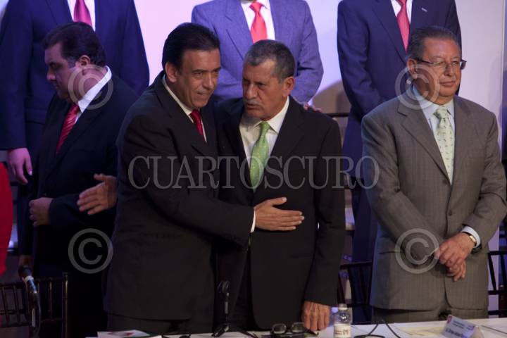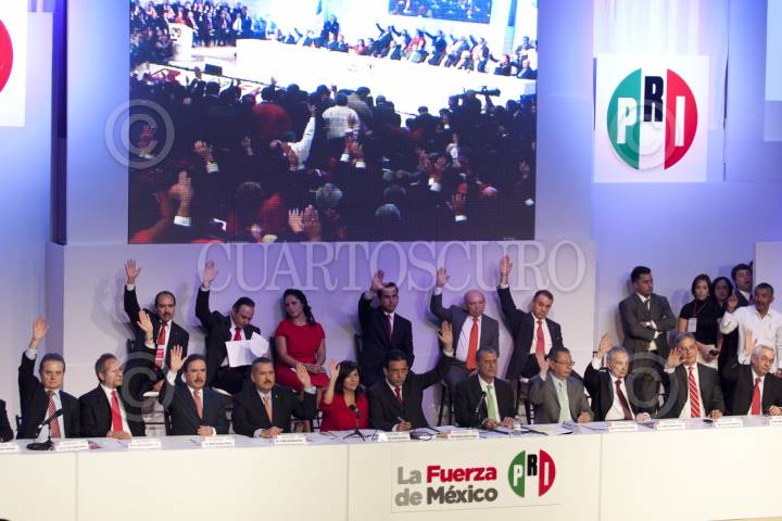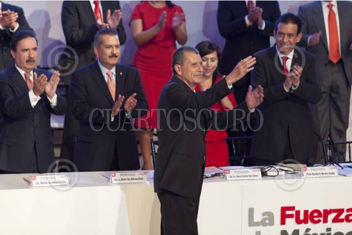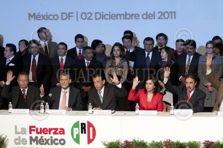 MÉXICO, D.F., 08OCTUBRE2011.- Emilio Gamboa Patron, lider de la CNOP; el senador Manlio Fabio Beltrones, María Cristina Díaz, secretaria general del PRI; Humberto Moreira, presidente nacional del PRI; Enrique Jackson, secretario técnico; el diputado Francisco Rojas; Joaquin Gamboa Pascoe, lider de la CTM, durante una votación en el Consejo Político Nacional del Partido Revolucionario Institucional (PRI), en donde se aprobó que la elección del candidato presidencial sea directa y abierta a militantes y simpatizantes; este evento se realizo en la sede nacional del partido. FOTO: RODOLFO ANGULO/CUARTOSCURO.COM