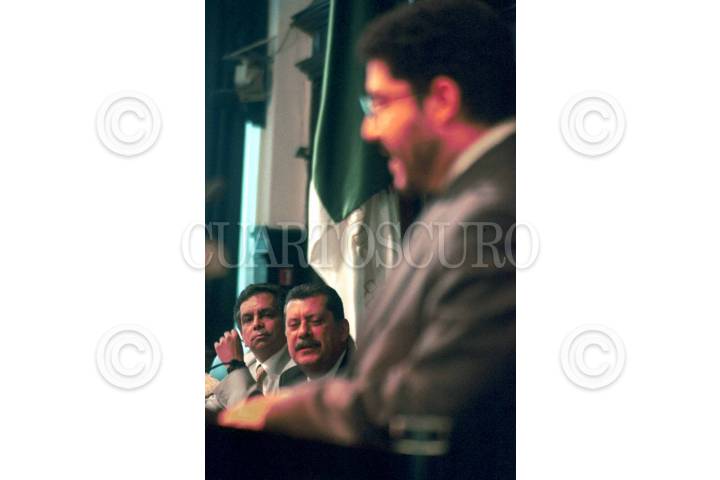 Los senadores priistas Fidel Herrera y Enrique Jackson escuchan con atención el turno en tribuna de el diputado perredista Marti Batres, durante la sesión de la Comisión Permanente en el Senado, despúes de haber acudido a la Suprema Corte de Justicia para presentar la controversia constitucional. FOTO:Oswaldo Ramírez/CUARTOSCURO.COM
