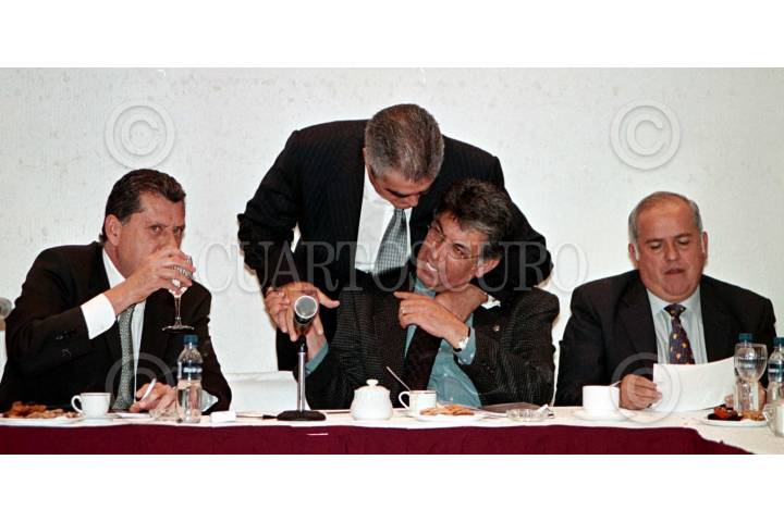 Jesús Ortega y Enrique Jackson, coordinadores de las fracciónes parlamentaria del PRD y PRI en el Senado respectivamente y José Murat, gobernador de Oaxaca y Ricardo Monreal, gobernador de Zacatecas , durante la reunión que sostuvieron con senadores priístas y perredistas para informar sobre la propuesta de la Conago sobre el Presupuesto de Egresos 2003. FOTO: Oswaldo Ramírez/CUARTOSCURO.COM