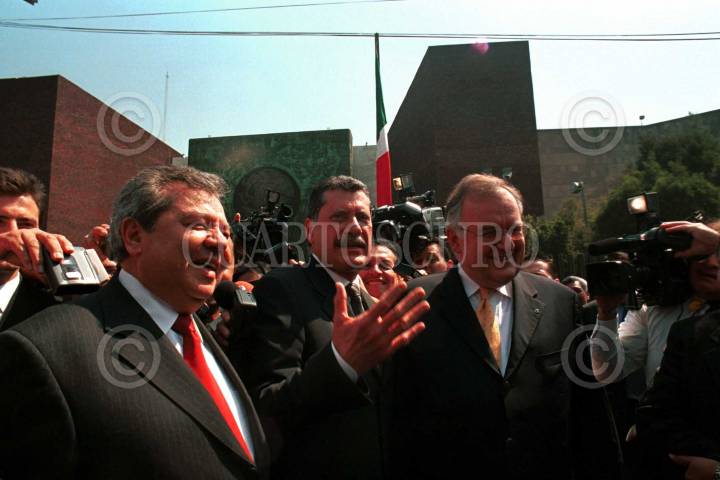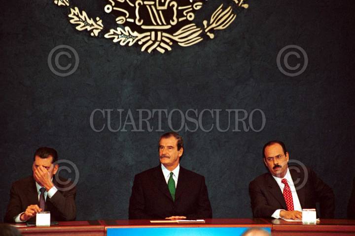 Enrique Jackson, presidente de la Mesa directiva del Senado, Vicente Fox Quesada presidente de México, y Armando Salinas Torre presidente de la mesa directiva de la cámara de diputados, durante la reunión para la firma decreto por el que se expide la Ley del Servicio Profesional de Carrera en la Administración Pública Federal, que se llevó a cabo en el salón Adolfo López Mateos de la residencia oficial de Los Pinos. FOTO: Eunice Adorno/CUARTOSCURO.COM