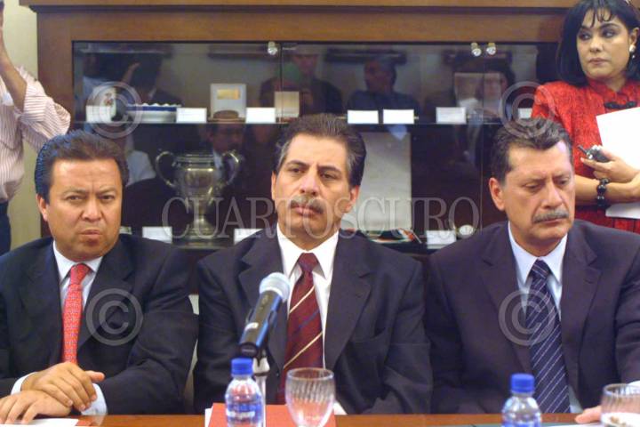 Enrique Jackson, coordinador de la fracción parlamentaria de PRI en el Senado, José Murat, gobernador de Oaxaca y Fernando Moreno Peña, gobernador de Colima, durante la reunión que sostuvieron con senadores priístas y perredistas para informar sobre la propuesta de la Conago sobre el Presupuesto de Egresos 2003. FOTO: Oswaldo Ramírez/CUARTOSCURO.COM
