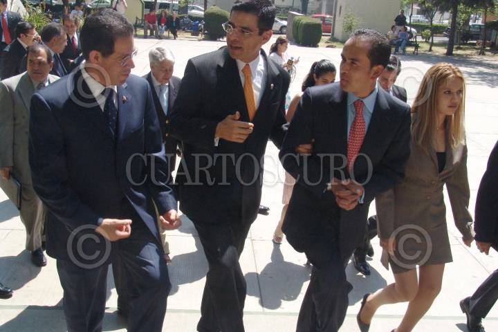 TOLUCA ESTADO DE MEXICO 15MARZO2006.- José Martínez Vilchis, Rector de la Universidad Autónoma del Estado de México, Enrique, Enrique Jacob Rocha, Secretario de Desarrollo Económico estatal y Ricardo Aguilar Castillo, Secretario del Trabajo estatal, en la facultad de economía de la universidad. FOTO: Noé Marure/CUARTOSCURO.COM