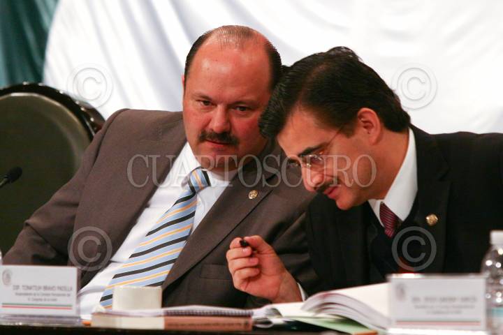 MÉXICO D.F., 22DICIEMBRE2008.- El senador Luis Alberto Villareal conversa con el presidente de la mesa directiva Cesar Duarte Jacquez , durante la sesión permanente, realizado en la Cámara de Diputados. FOTO: SAÚL LÓPEZ/CUARTOSCURO.COM