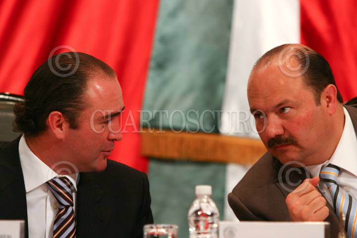 CHIHUAHUA, CHIHUAHUA, 01OCTUBRE2011.- Rodrigo Medina, gobernador de Nuevo León, y César Horacio Duarte, gobernador del Estado, durante el Primer Informe de Gobierno de éste, en el Centro de Convenciones de Chihuahua. FOTO: CUARTOSCURO.COM