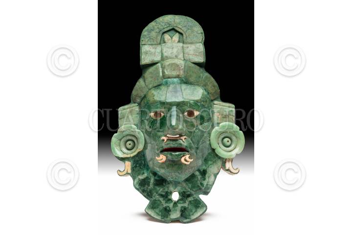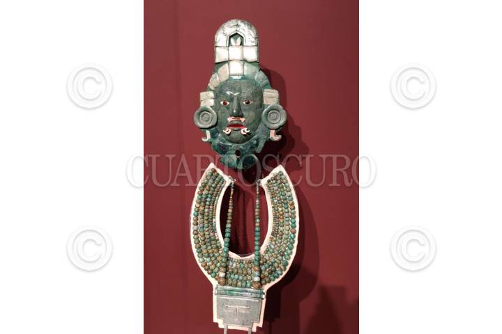 OAXACA, OAXACA, 19JULIO2019.- Máscara de Calakmul, elaborada en mosaico de jade, concha y obsidiana gris perteneciente a la colección facsimilar llegara al estado en el marco de la Guelaguetza. FOTO: INHA /CUARTOSCURO.COM