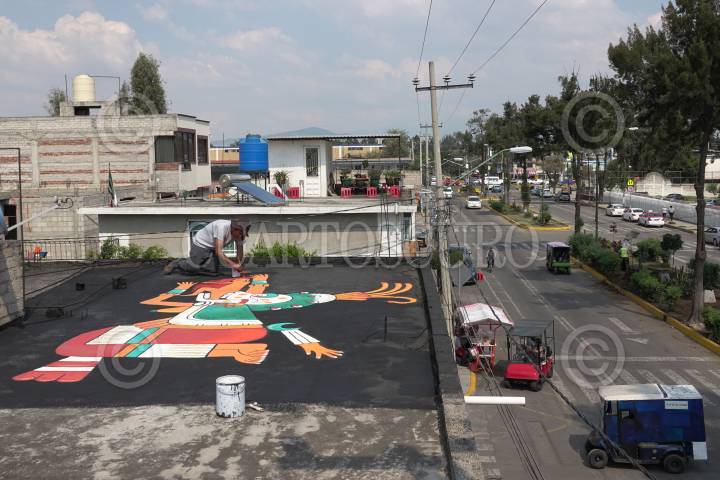 La muralista Ivon pinta los detalles de un mural de la exposición aérea “Aeromictlán” que será exhibida del 27 de octubre al 5 de noviembre en la calle Santiago Borras, colonia Santa Cecilia, alcaldía Tláhuac