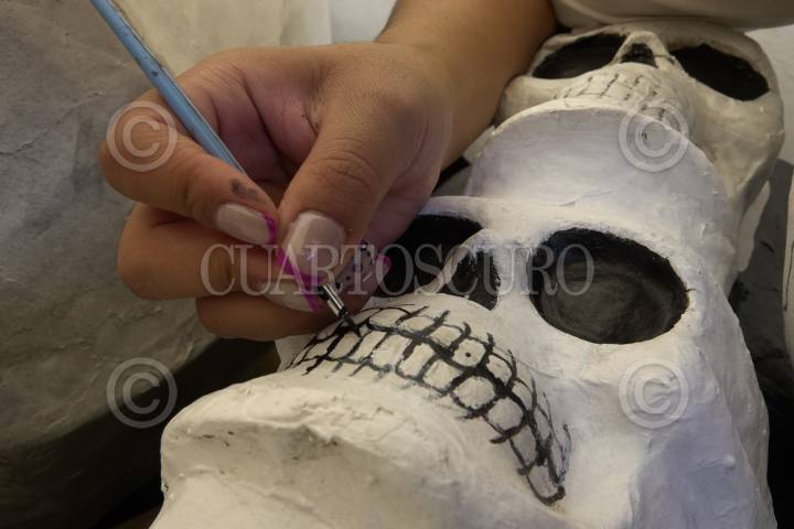 Detalle de las catrinas monumentales que serán exhibidas del 27 de octubre al 5 de noviembre en la calle Santiago Borras, colonia Santa Cecilia, alcaldía Tláhuac