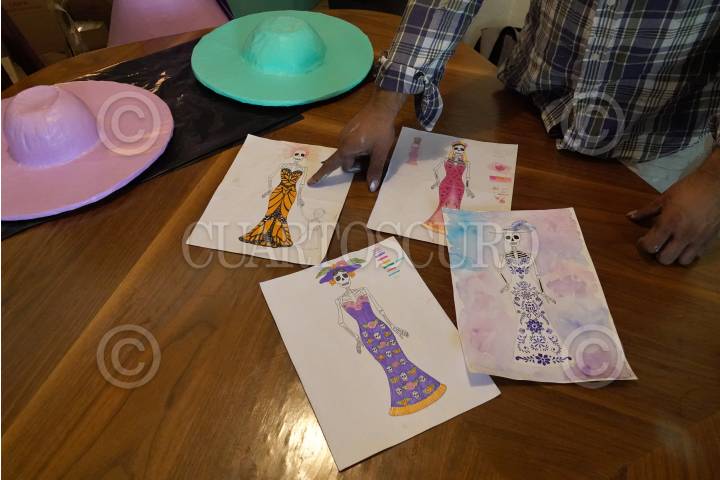 Raymundo Medina, representante del Colectivo Jaén Cartonería, muestra los bocetos de las catrinas monumentales que serán exhibidas del 27 de octubre al 5 de noviembre en la calle Santiago Borras, colonia Santa Cecilia, alcaldía Tláhuac