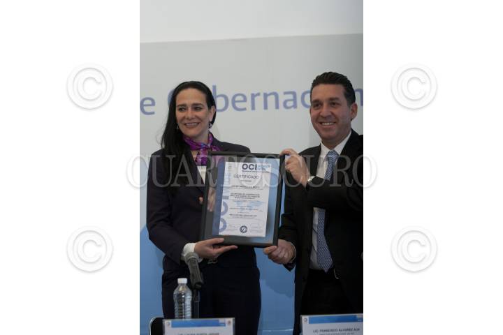 MÉXICO, D.F., 17ENERO2012.- Laura Gurza Jaidar, Coordinadora General de Protección Civil, recibió el reconocimiento de OCI World Wide Organismo de Certificación Internacional por parte de Francisco Álvarez Aja, Director General de OCI, esto en las instalaciones de la Secretaria de Gobernación. FOTO: GUILLERMO PEREA/CUARTOSCURO.COM