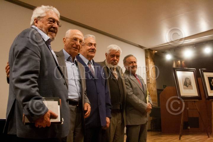 CIUDAD DE MÉXICO, 16JUNIO2019.- El ensayista Adolfo Castañón, el poeta Jaime Labastida; el editor Gonzalo Celorio; el escritor Felipe Garrido, y el poeta Jorge Ruiz Dueñas, durante la celebración por los 80 años del poeta y escritor sinaloense, en la Sala Manuel M- Ponce del Palacio de Bellas Artes. FOTO: GALO CAÑAS /CUARTOSCURO.COM