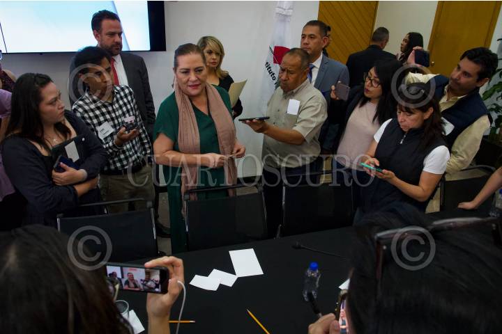 Guadalupe Taddei, consejera presidenta, durante la conferencia a medios en el INE.