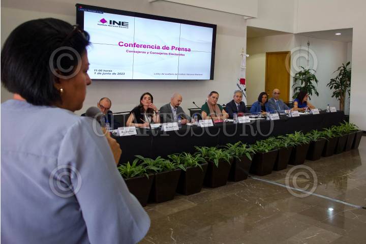 Jaime Rivera, Dania P Ravel, Arturo Castillo, Guadalupe Taddei, Miguel A. Patiño, Norma de la Cruz, Martín Faz y Claudia Zavala, durante la conferencia a medios en el INE.