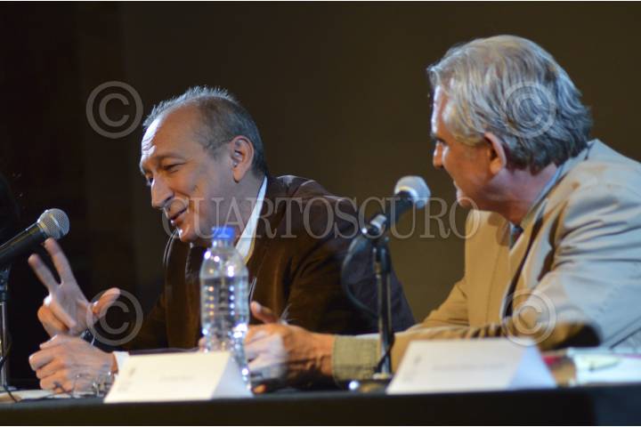 CIUDAD DE MÉXICO, 29MARZO2016.- El poeta chiapaneco, Jaime Sabines, fue recordado en la sala Manuel M. Ponce del Palacio de Bellas Artes por su primogénito Julio Sabines; la escritora, Pilar Jiménez; Claudio Isaac, cineasta mexicano y Fernando Rivera, músico, esto a 90 años del nacimiento del escritor y 17 de su muerte. Su hijo recordó a su padre con algunos versos que él les recitaba cuando eran más chicos. En la imagen Julio Sabines y Claudio Isaac. FOTO: GALO CAÑAS /CUARTOSCURO.COM