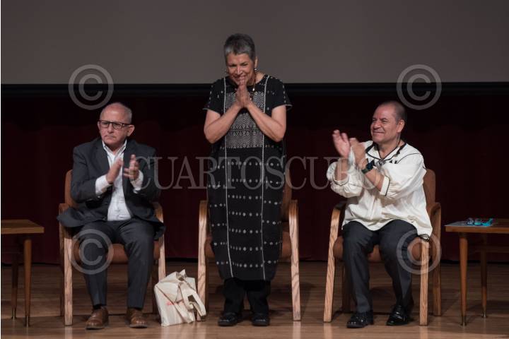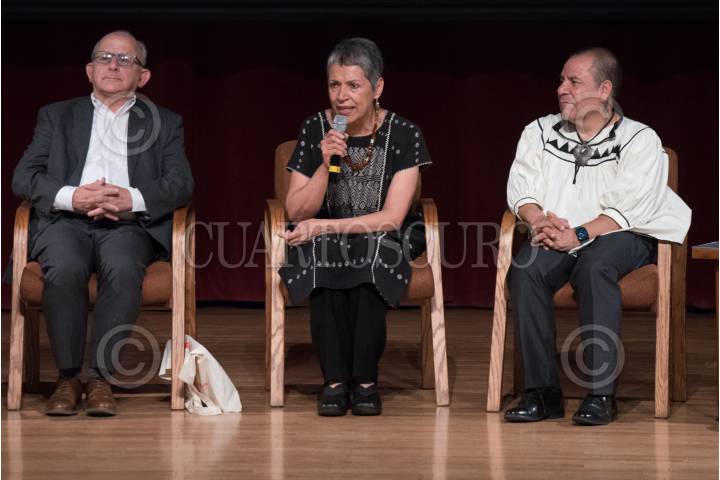 Teresa Márquez Martínez, museógrafa, durante su homenaje en el Auditorio Jaime Torres Bodet del Museo Nacional de Antropología, acompañada de Diego Prieto Hernández, director general del INAH y Antonio Zúñiga. director del Centro de Cultura Helénico.
