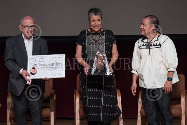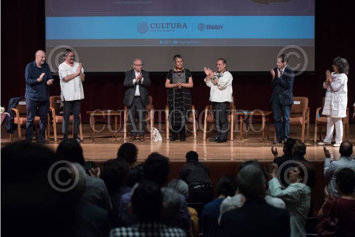 Diego Prieto Hernández, director general del INAH; Antonio Zúñiga, director del Centro de Cultura Helénico; José Luis Perea González, secretario técnico del INAH; Marco Barrera Bassols, coordinador de Vinculación Internacional del Fondo de Cultura Económica y el periodista Luis Hernández Navarro, encabezaron en el Auditorio Jaime Torres Bodet del Museo Nacional de Antropología, el homenaje a la museógrafa Teresa Márquez Martínez.